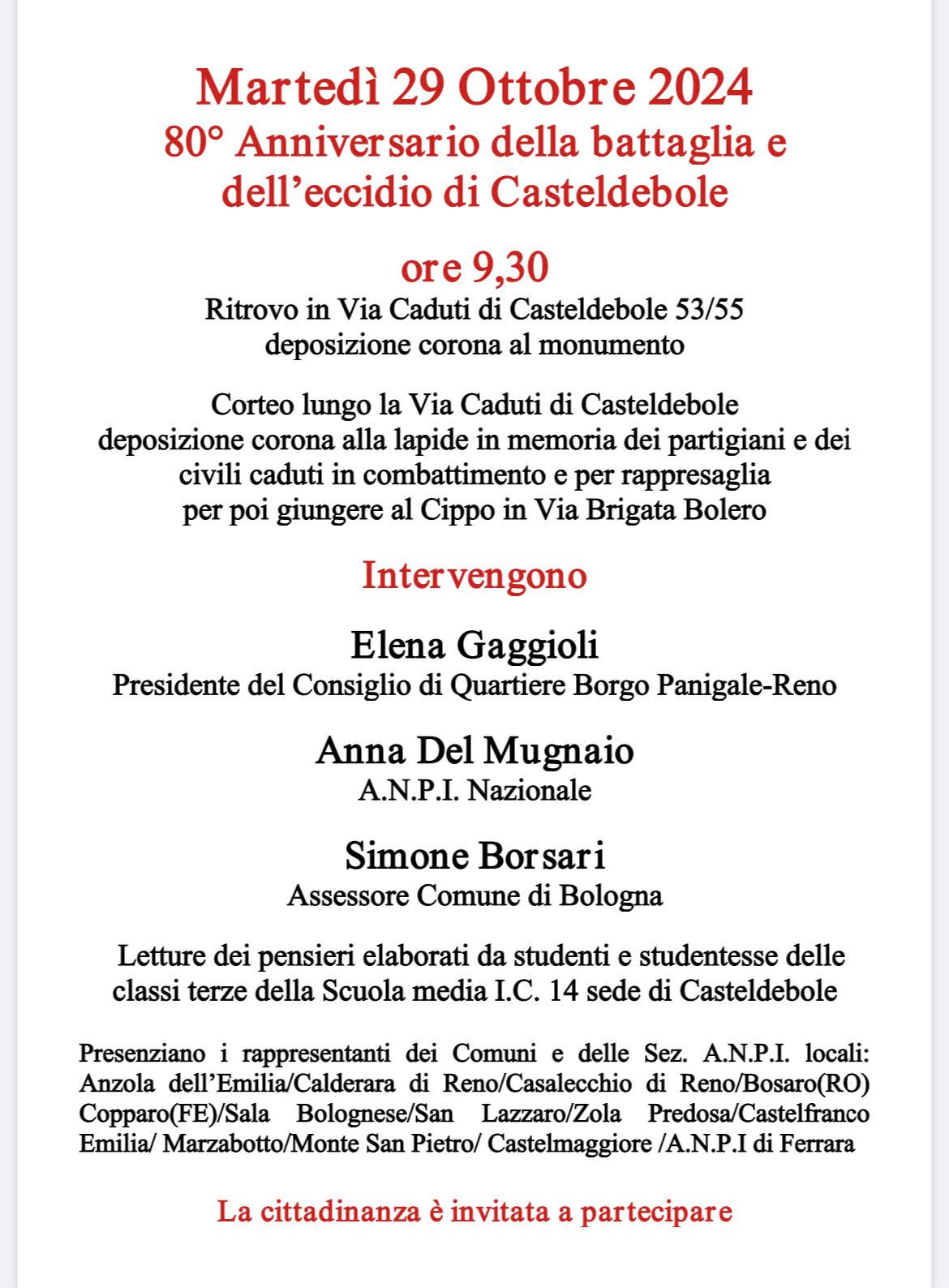 | Programma del 80° anniversario della Battaglia e dell’eccidio di Casteldebole |