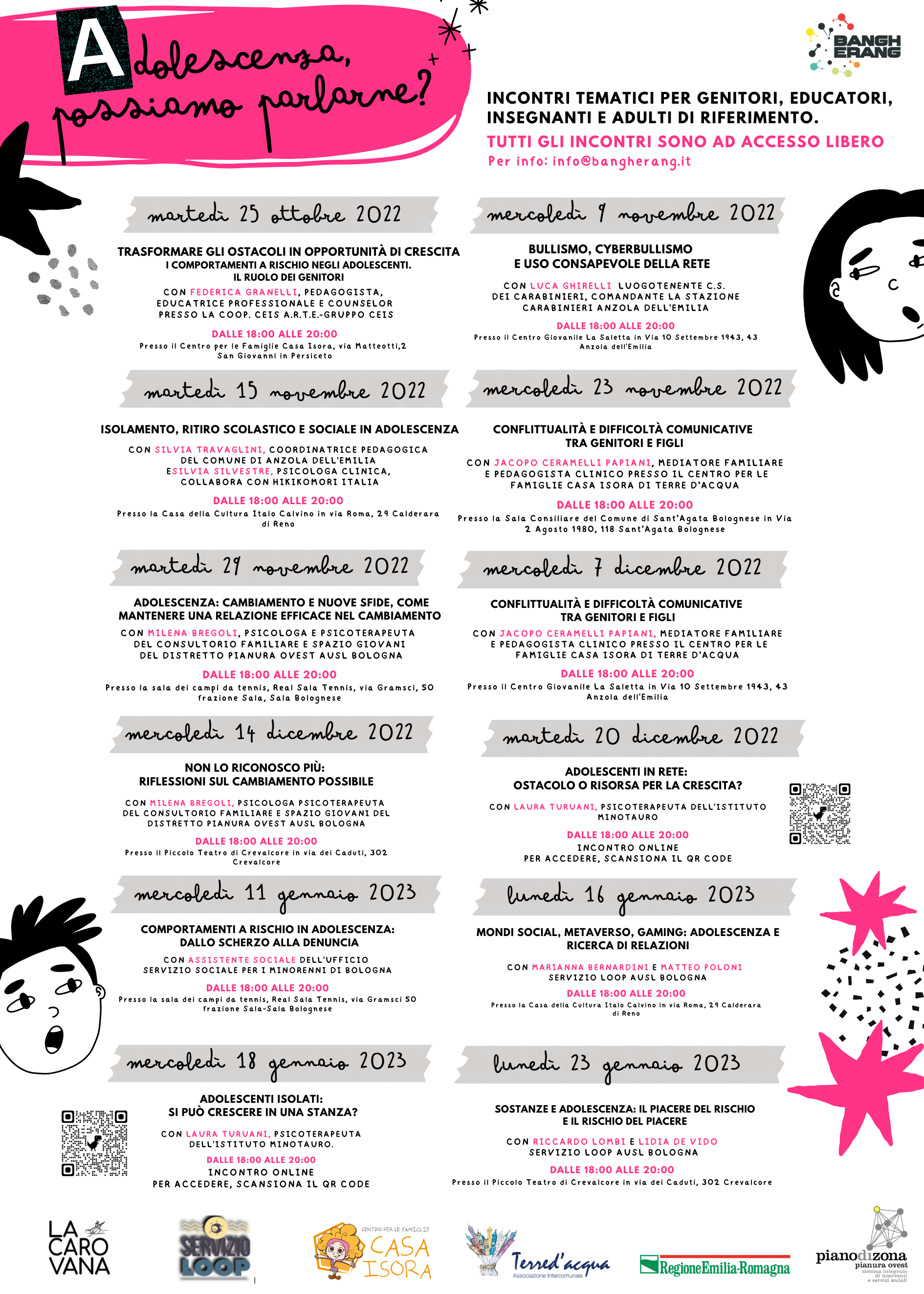 "Adolescenza, possiamo parlarne?" Si rivolge a genitori, educatori, insegnanti e adulti di riferimento. La proposta mira a sostenere i destinatari nel loro ruolo educativo con adolescenti, in particolare nelle dinamiche relazionali che riguardano situazioni di conflittualità e comportamenti a rischio. Gli incontri saranno volti all'approfondimento di tematiche quali le difficoltà comunicative tra genitori e figli, il ritiro sociale e scolastico, l’utilizzo responsabile dei social e del cellulare e la bassa percezione del rischio. Ogni appuntamento sarà guidato da un esperto o esperta del settore socio-psico pedagogico.
