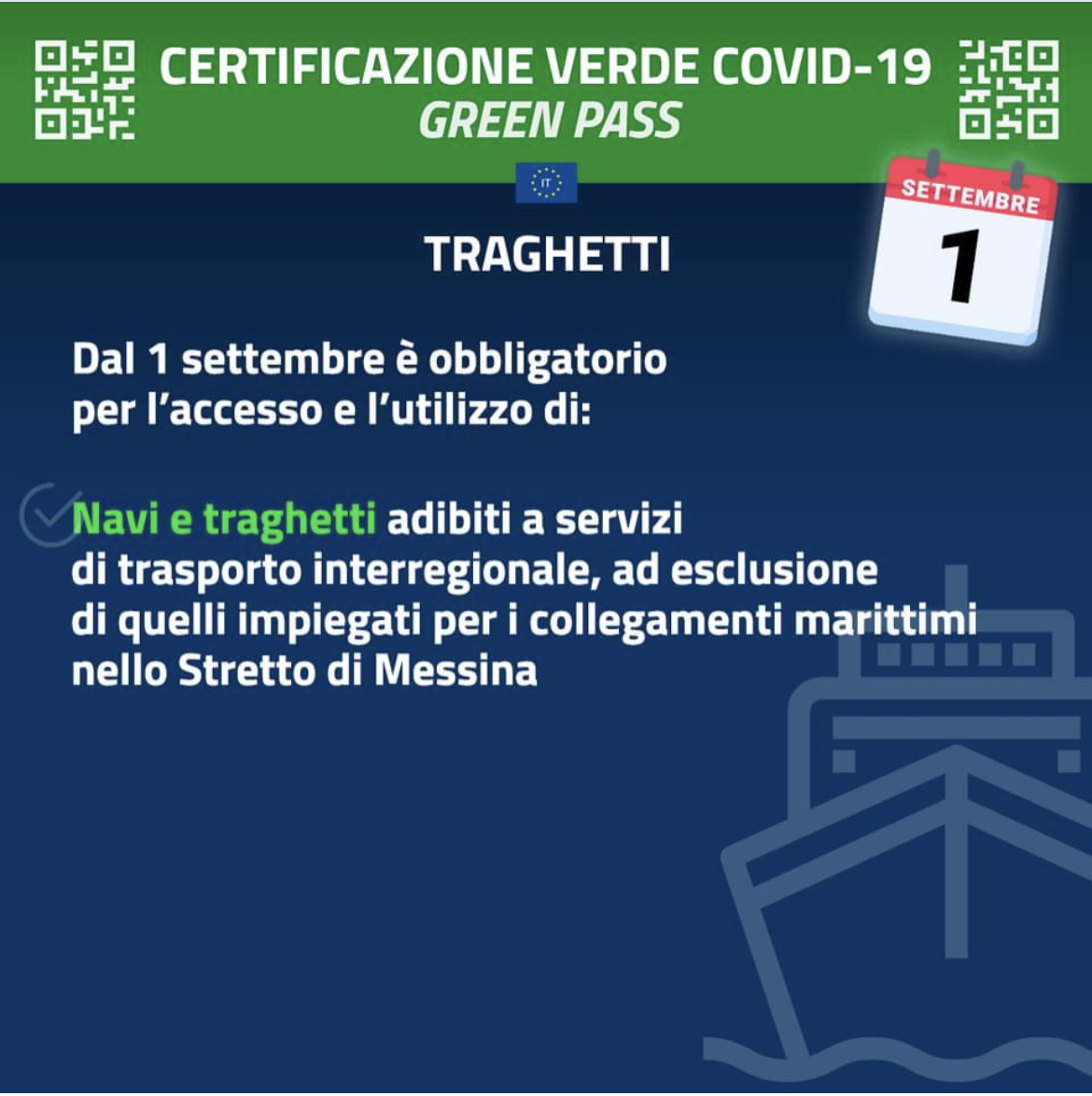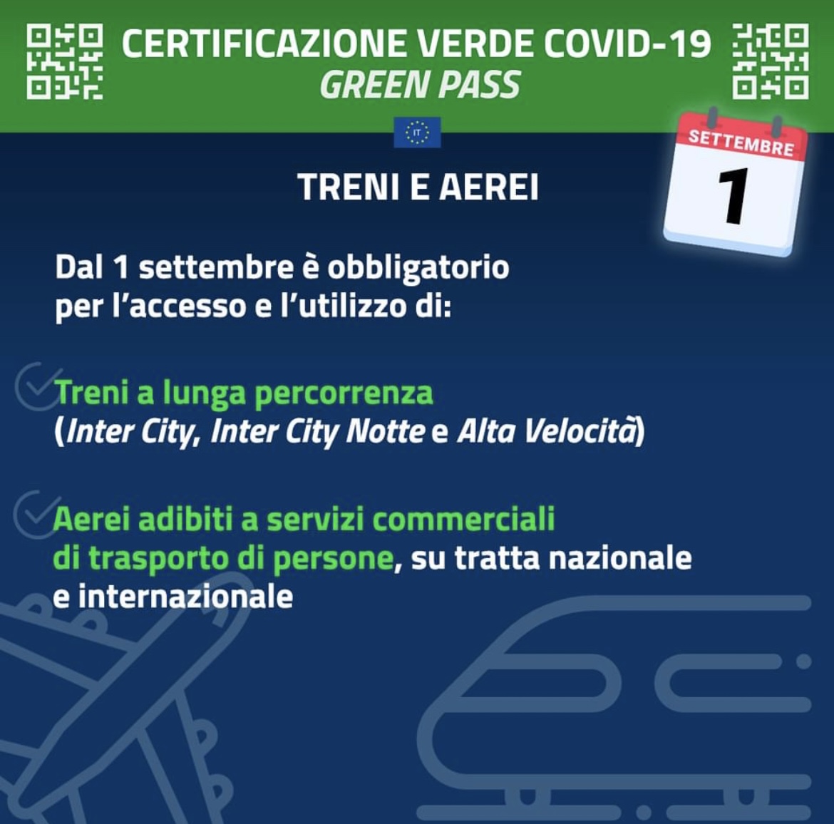 Da oggi diventa obbligatorio l'uso del Green Pass per salire su mezzi di trasporti a lunga percorrenza: treni (Inter city, Inter city notte, Alta velocità) navi, aerei (aerei adibiti a servizi commerciali di trasporto di persone su tratte nazionali e internazionali) e autobus.