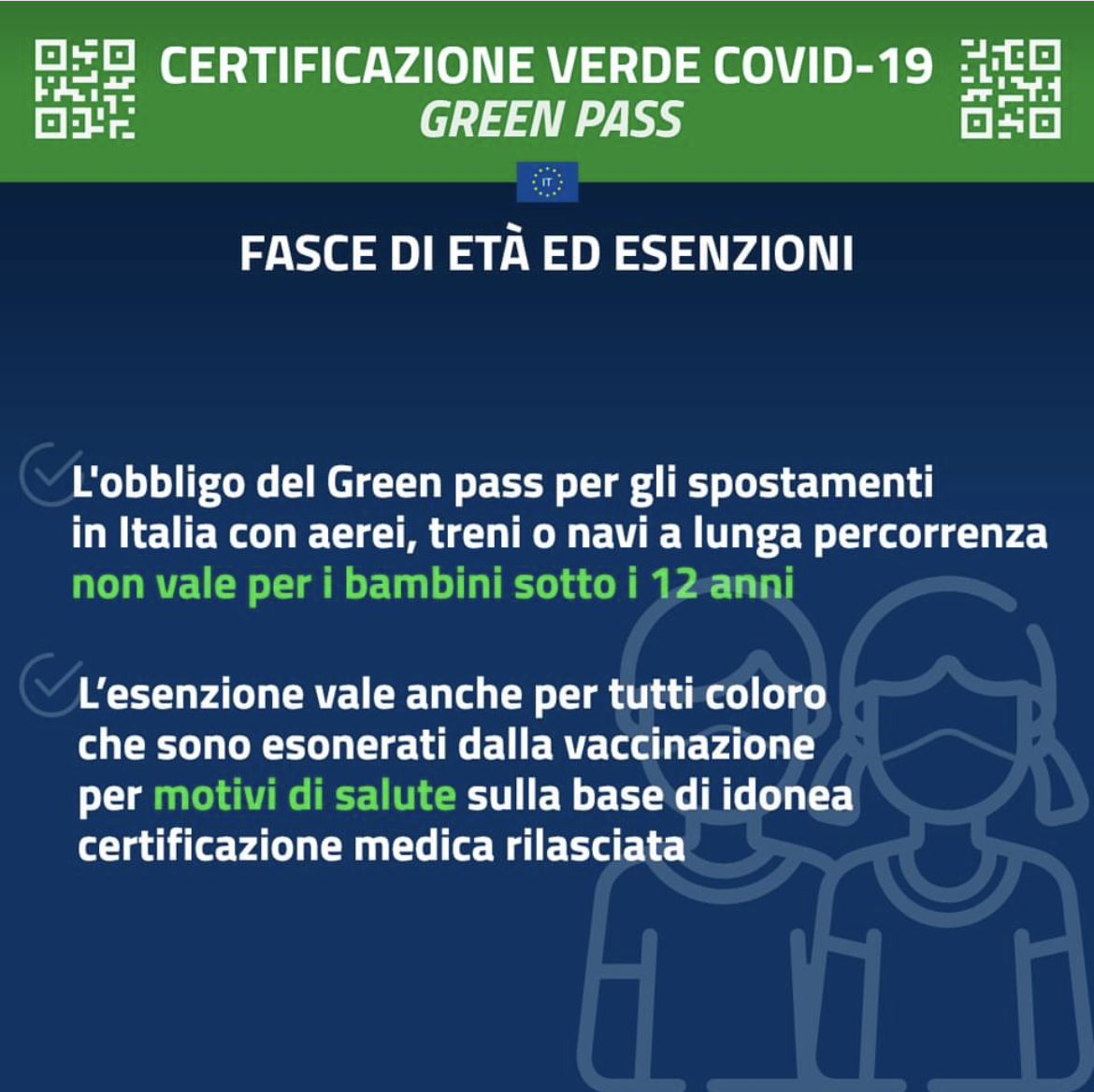 L’obbligo del Green Pass per gli spostamenti in Italia con treni aerei o navi a lunga percorrenza non vale per i bambini sotto ai 12 anni e l’esenzione vale anche per tutti coloro che sono esonerati per motivi di salute sulla base di idonea cerrtificazione medica.