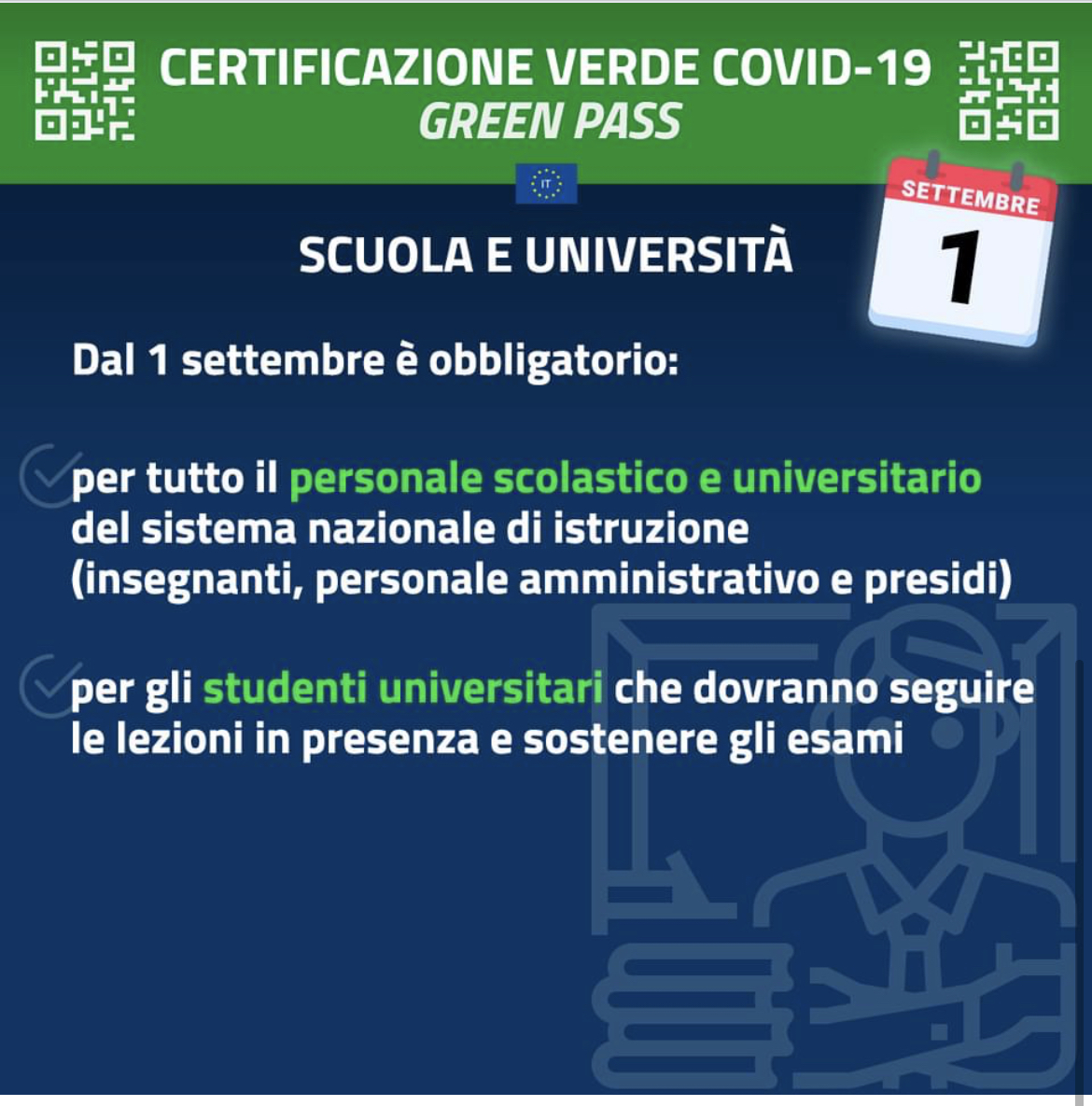 Scuola e Università obbligo per personale scolastico e universitario del sistema nazionale di istruzione (insegnanti, personale amministrativo,e Presidi), per gli studenti universitari che dovranno seguire le lezioni in presenza e sostenere gli esami.