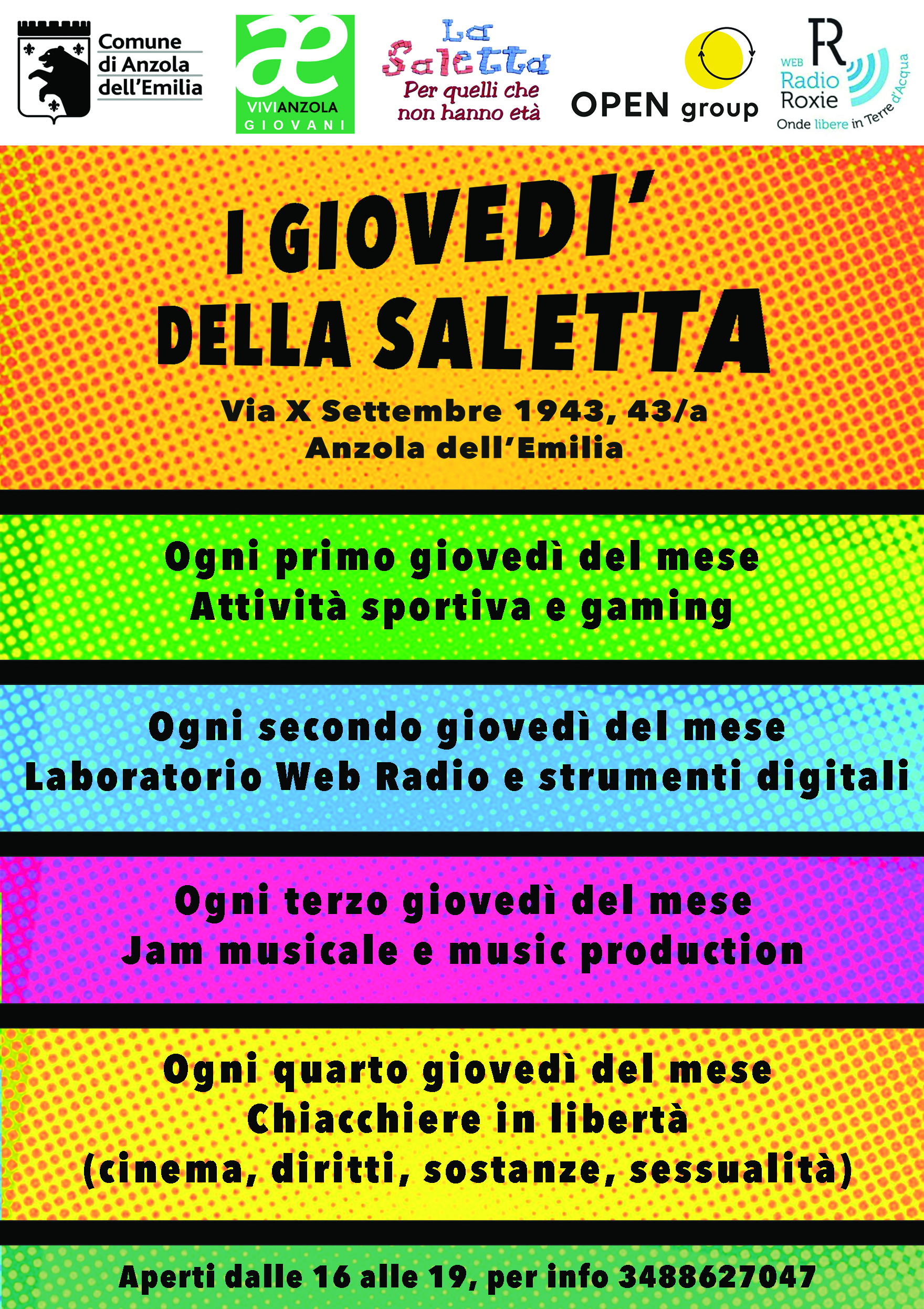a partire da giovedì 11 novembre il Centro di Aggregazione Giovanile "La Saletta", dalle ore16 alle ore 19 propone "I Giovedì della Saletta" , un vasto programma di attività che si svilupperà mensilmente. Gioco in libertà, videogiochi, musica, web radio, sport, gaming, strumenti digitali, jam musicale e music production ...