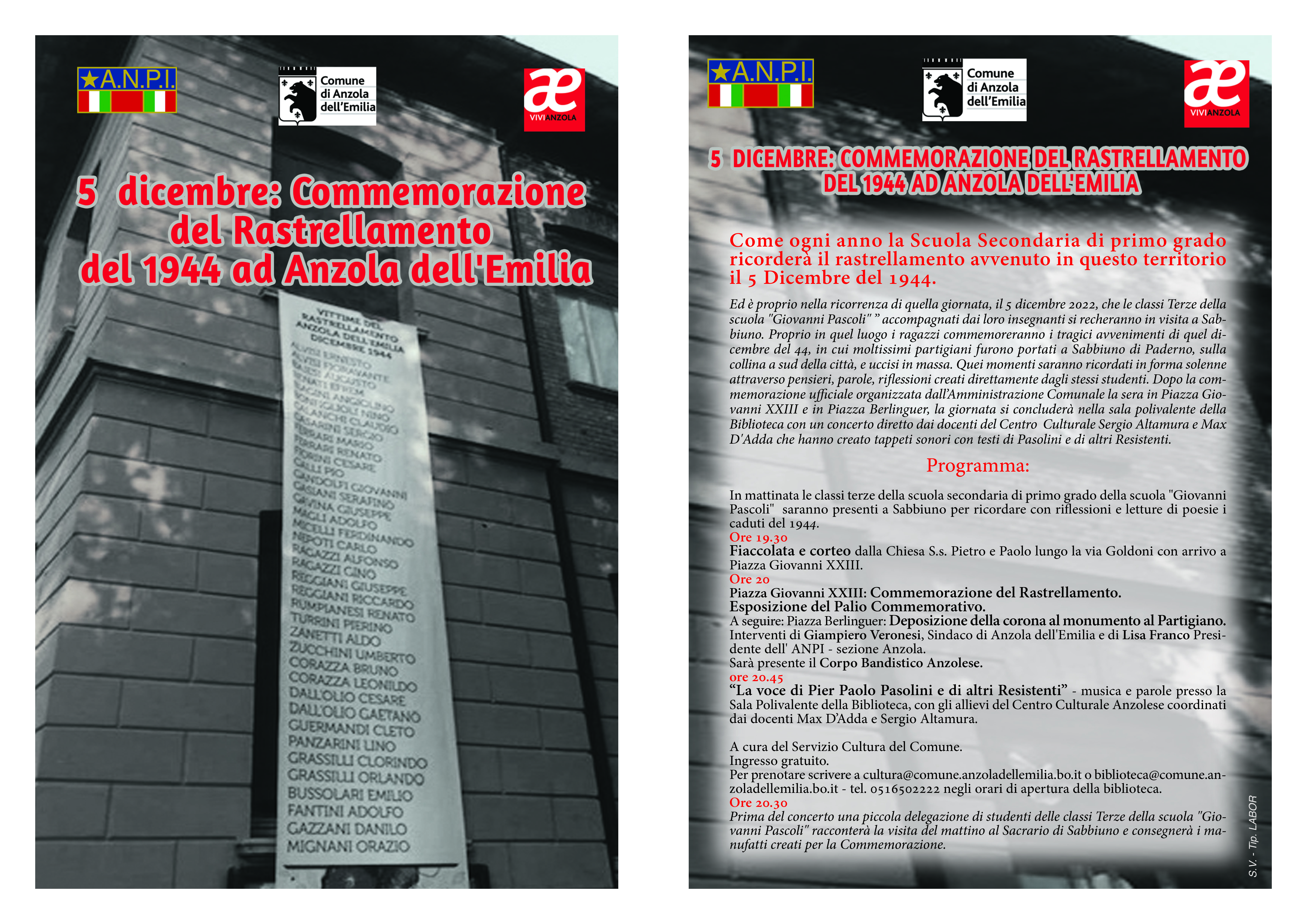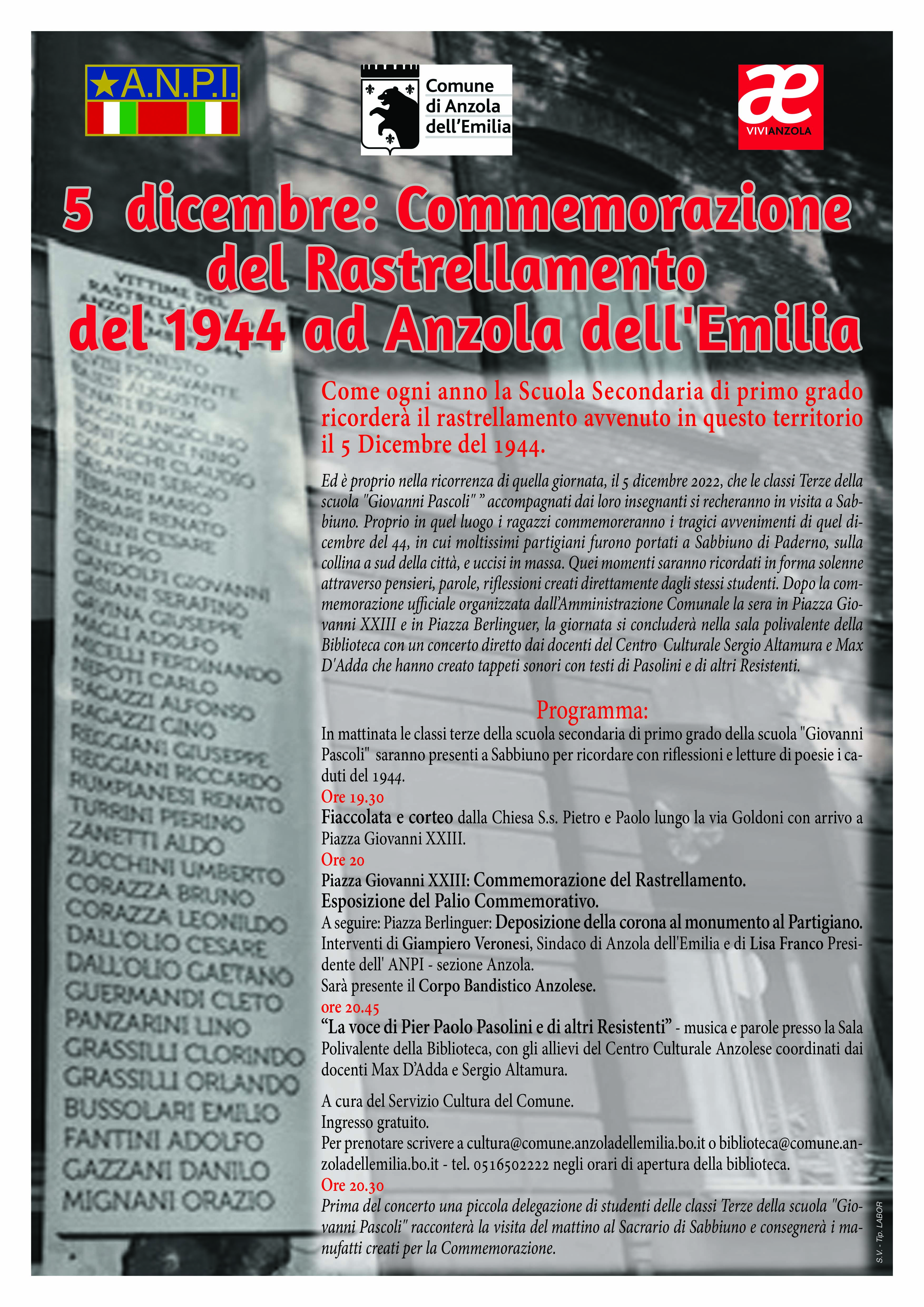 Come ogni anno, la Scuola Secondaria di primo grado ricorderà il rastrellamento avvenuto in questo territorio il 5 Dicembre del 1944. Il 5 dicembre 2022, che le classi Terze della scuola "Giovanni Pascoli" ” accompagnati dai loro insegnanti r dall’Assessore Comunale Carmine Maddaloni. si recheranno in visita a Sabbiuno. Proprio in quel luogo i ragazzi commemoreranno i tragici avvenimenti di quel dicembre del 44, in cui moltissimi partigiani furono portati a Sabbiuno di Paderno, sulla collina a sud della città, e uccisi in massa. Quei momenti saranno ricordati in forma solenne attraverso pensieri, parole, riflessioni creati direttamente dagli stessi studenti. Dopo la commemorazione ufficiale organizzata dall’Amministrazione Comunale la sera in Piazza Giovanni XXIII e in Piazza Berlinguer, la giornata si concluderà nella sala polivalente della Biblioteca con un concerto diretto dai docenti del Centro Culturale Sergio Altamura e Max D'Adda che hanno creato tappeti sonori con testi di Pasolini e di altri Resistenti.